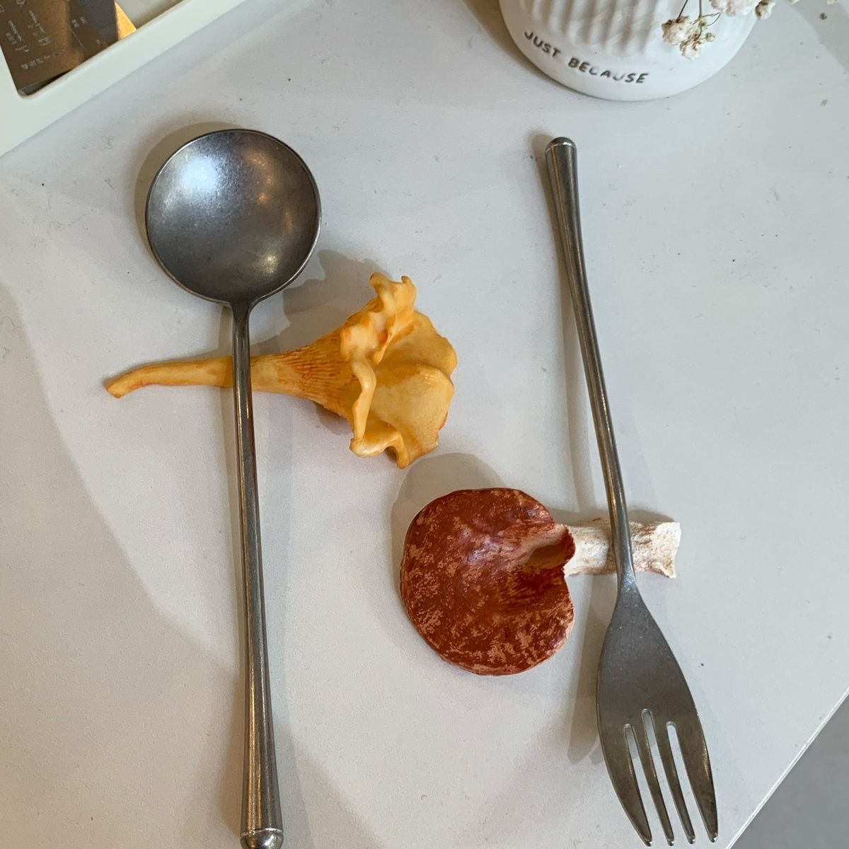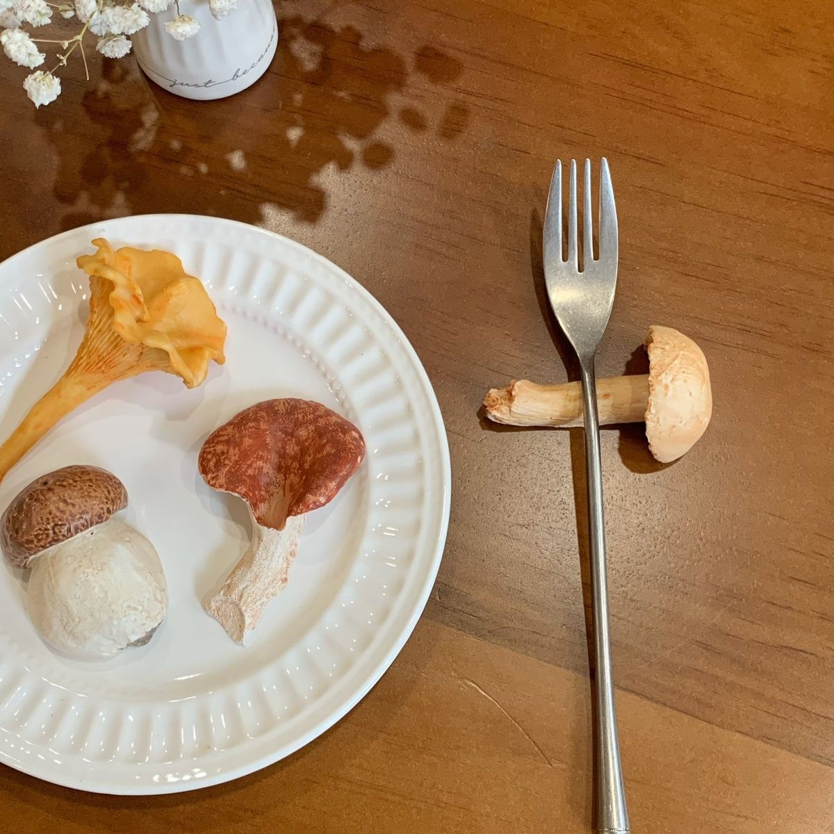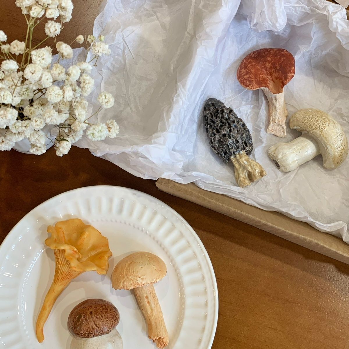 Rich in detail and color, these wild mushrooms bring warmth, character, and a playful charm to your table. They look wonderfully realistic—almost delicious—but please don’t eat them.